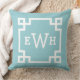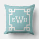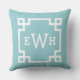 A classic aqua throw pillow featuring a customisable three-letter monogram inside a white Greek key geometric border frame. The fresh white-on-aqua design brings a cool, coastal accent to living rooms, bedrooms, or beach house decor. Personalise with your initials or a couple's monogram for a stylish gift.