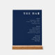 This is a minimalist style image featuring an elegant bar menu with a deep navy background and crisp white text. The layout is clean and organised, listing various beverages including beer, wine, and spirits in a straightforward manner. It exudes sophistication and simplicity, making it perfect for a cosy evening at the bar or a stylish addition to any establishment's decor.