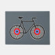 A modern look doormat for cyclists and anyone who's into bikes. In the centre of the design is a black and white graphic of a classic men's bicycle. The bike frame is solid black with a white outline and retro look spokes. In the centre of the wheels is a red, white, blue and black target graphic. The background panel is dark grey but you can change the colour to suit with the customise button. The door mat would be a stylish yet fun and practical housewarming or new home gift for the biker in your life.