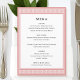 Create your own personalised table menus for a special event. Classic typography and a Greek key border add timeless elegance to your celebration — a geometric, maze-like pattern, inspired by ancient Greek and Roman art. This editable template lets you customise the text to perfectly suit your dishes or courses. Perfect for a formal dinner party, elegant lunch, brunch, birthday, wedding, or other event. Printed colours: pink and white, with dark grey lettering.