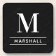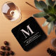 A striking beverage coaster featuring a crisp white serif initial and custom family name monogram with horizontal rules on a dramatic black marble stone background. The bold contrast creates a sleek, modern-classic accent for any space. A standout personalized gift for groomsmen, housewarmings, or Father's Day. All text is fully customizable.