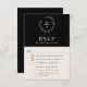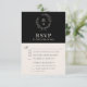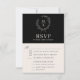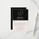A tasteful and classic choice in wedding response cards, this design conveys a simple elegance in its text layout and classic style. A simple open laurel wreath of sketched leaves surrounds the monogram initial of the bride and groom. The elegant yet simple text template has meal selections that you can personalise with your desired entrees. This response card is a versatile choice for weddings at any season of the year and for any wedding venue, whether a solemn religious ceremony or a secular type affair at a banquet hall, winery, museum, restaurant, private club, or a rustic wedding outside in nature. It is available in a variety of popular colours (shown here in classic black and ecru) as well as many different paper types and weights.