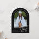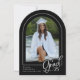 A classic black and white graduation photo announcement but with a modern twist. FRONT: "Grad" is shown in a trendy handwritten script and partially overlays the arch-shaped photo. Personalise the template with your grad's photo, first/last names, school name and last two digits of their graduating year. BACK: An elegant geometric pattern with bows (with the option to delete). © Kimbellished, LLC