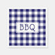 Get ready for your summer barbecue party with paper napkins featuring dark blue, white, and light blue squares in a classic buffalo plaid with the letters BBQ in a white rectangle in the centre.