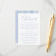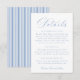 Share important wedding information with this classic blue wedding details card, designed to coordinate seamlessly with timeless and traditional wedding stationery suites. This elegant details card features graceful calligraphy-style lettering paired with clean serif typography for a polished, easy-to-read layout. The minimalist design keeps the focus on your event information, while the coordinating blue and white stripe pattern adds a refined, heritage-inspired touch. Perfect for including accommodations, reception details, wedding website information, or attire style, this wedding information card is ideal for classic, garden, and estate weddings. Personalize the wording to create a cohesive details insert that completes your wedding invitation suite beautifully.