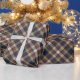 This elegant and contemporary gift wrapping paper showcases a plaid pattern in shades of green, dark blue, red, and ochre yellow, creating a classy and nostalgic English holiday atmosphere. The paper is perfect for wrapping Christmas gifts in a classic colonial style and complements a charming country cottage or log cabin theme.