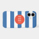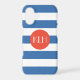 Dress up and protect your iphone with a classic blue cabana style striped pattern with a round circle design element that is custom monogrammed with your first, middle and last name initials in a stylish Sans Serif font. Classic blue, white and peppy orange colours.