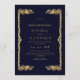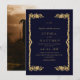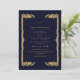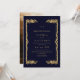 Modern stylish dark wedding invitation blue with gold dust on with a gold ink pour effect (the gold is a digital effect, not real foil) and modern calligraphy. Classy and elegant, simple and modern invitation.