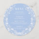 Enter into timeless elegance with our rustic bohemian spring/summer round wedding menu card, showcasing a delightful wreath of delicate wildflower blooms in soothing light blue tones. Enhance your wedding dining experience with this sophisticated addition, designed to bring a sense of refinement to your celebration. Perfect for rustic, bohemian, and outdoor wedding themes, this menu card sets the stage for an unforgettable event. Explore the beauty of this exquisite wedding detail and make your special day truly memorable.