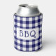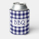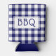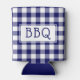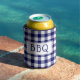 Keep your drinks cool in style at a barbecue with can coolers featuring dark blue, white, and light blue squares in a classic buffalo check plaid with the letters BBQ in a white rectangle on each side.