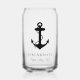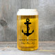 A nautical-themed can glass for your boat featuring a classic black anchor and your boat's name and location in elegant script and typography.