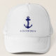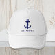 Nautical-themed hat featuring a navy blue illustration of a classic anchor and your boat's name in simple navy blue typography.