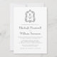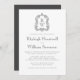 This elegant vintage-inspired wedding invitation design features a pair of monogram initials in open serif font above and below a dividing line and encircled by a line art acanthus crest on a white background. The back of the card is solid charcoal grey.