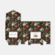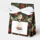 Timeless and elegant yet festive holiday-themed wedding favour box design featuring classic hand-drawn gold floral crest accented by a colourful spray of red and white Christmas flowers and evergreens. This custom formal template includes editable text fields on a blank element with a gold textured border. The outside features a colourful complementary seamless Christmas floral background pattern.
