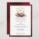 Timeless and elegant yet festive holiday-themed wedding design featuring classic hand-drawn gold floral crest accented by a colourful spray of red and white Christmas flowers and evergreens. This custom formal template includes editable text fields as well as custom calligraphy text graphics and a gold textured border. The outside border and back features an opulent, ruby red velvet texture background.