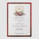 Timeless and elegant yet festive holiday-themed wedding design featuring classic hand-drawn gold floral crest accented by a colourful spray of red and white Christmas flowers and evergreens on a semi-opaque vellum paper. This custom formal template includes editable text fields as well as custom calligraphy text graphics and a red and gold textured border.