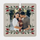 This beautiful Christmas photo ornament features a hand drawn floral and greenery frame in classic Christmas colours of deep green, burgundy red, and ivory over a sand beige background. Works well with many decor themes - rustic, farmhouse, contemporary, traditional, or vintage. Easy to customise with a favourite photo (and also makes a great gift)!