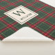 Custom-designed family name monogram blanket for the holiday season featuring classic style forest green and red Christmas plaid with personalised initial and name.
