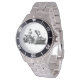Has heft and feel of expensive stainless steel quartz watches. Good band with safety catch. I removed links, which is easy because engraved arrows show direction to push the linking pins. As always by this seller, the image (a railroad logo) is a perfect reproduction of my emailed image, and is precisely spaced and aligned.