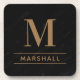 A sophisticated beverage coaster featuring a warm cognac tan serif initial and custom family name monogram with horizontal rules on a dramatic black stone background. The rich cognac tone against dark marble creates a refined, library-worthy aesthetic. A distinguished personalized gift for groomsmen, Father's Day, or housewarmings. All text is fully customizable.