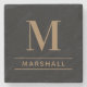 A sophisticated stone coaster featuring a warm cognac tan serif initial and custom family name monogram with horizontal rules on a dark charcoal stone background. The rich cognac tone against the dark backdrop evokes a refined, leather-and-library aesthetic. A distinguished personalised gift for groomsmen, housewarmings, or Father's Day. All text is fully customisable.