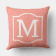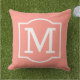 A classic outdoor pillow featuring a bold white monogram initial inside a decorative bracket frame on a warm coral background. The oversized serif letter and elegant notched border bring a summery, feminine accent to patio seating, garden furniture, or poolside chairs. The initial is fully customisable.