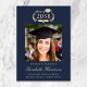 Celebrate your graduate's remarkable academic achievement with this elegant college graduation announcement, designed with a timeless crest motif and classic script and typography. Featuring their class year framed by laurel branches and mortarboard and diploma icons, this design delivers a traditional collegiate look with enduring appeal. The centered photo layout highlights the grad’s portrait, while the text below showcases their name, university, and degree. The rich dark navy blue background paired with light gold lettering creates a sophisticated contrast that feels both formal and celebratory. Fully customizable, this graduation announcement can be adapted for high school graduates as well.