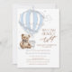This "we can bearly wait" design features a beige and brown watercolor teddy bear with a blue bow, sitting on a cloud next to a vintage toile de Jouy-style hot air balloon. This clean and classic layout is ideal for a baby shower with a timeless, neutral theme. Stylish calligraphy is paired with classic serif fonts.