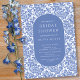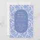Modern classy damask pattern with a stylish oval framing your party information in blue and white.
