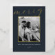 Classic minimalist two-sided family photo Christmas cards featuring gold foil frame on dark navy colour background with personalised family photo and holiday messages.