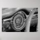 High definition monochrome photograph of a vintage 1950s American car's dashboard.