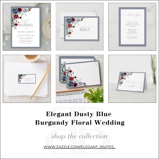 Based on our bestselling Bridal Shower invitation, this gorgeous classic and formal wedding invitation features bouquets of dusty blue, sage green, and eucalyptus botanical greenery, dusty blue and burgundy red marsala florals, and is bordered in a dusty blue. Personalise your details accented with beautiful modern hand lettered calligraphy in soft off-black. For that more formal wedding this invitation uses a classic verbage that that include the parents names. View the collection here: https://www.zazzle.com/collections/elegant_dusty_blue_burgundy_red_floral_watercolor-119997453644973827 Contact designer for matching products. Thank you sooo much for supporting our small business, we really appreciate it!