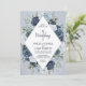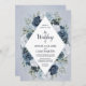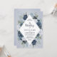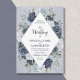A classic and elegant invitation displaying your wedding details inside a white diamond element surrounded by lush flowers in shades of blue, navy and white, all on a warm dusty blue watercolor background. The card reverses to a small floral arrangement in the centre. This invitation is part of a beautiful matching wedding suite that can be fully personalised.