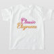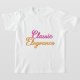 The t-shirt design features the phrase "Classic Elegance" in a vibrant, multi-colour rainbow font. The colours blend seamlessly, creating a striking and eye-catching effect against the black background. The design evokes a sense of timeless style and sophistication, perfect for those who appreciate both classic and modern aesthetics.