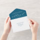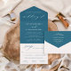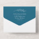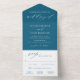 Classic and elegant blue sapphire all in one wedding invitation is a unique tri-fold invite option that is self-enclosed, sealed, mailed to guests with a detachable RSVP postcard; no need for envelopes! Design features modern calligraphy script accents with classic style typography. The guest address can be included on the back side - printed or handwritten, along with the postage for mailing. The back flap includes a simple floral accent with custom return address text, and the RSVP postcard includes the return address on the back so it can be torn off with help of a perforated fold and mailed back without an envelope. The blue sapphire / rich teal blue and white colours can be modified to coordinate with your wedding colour scheme.