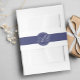 Classic formal calligraphy with circled script monogram simple elegant navy blue and white wedding invitation belly band.