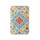 This beautifully arranged bathroom bath mat showcases a classic Mediterranean Talavera-style botanical flower design, Featuring a vibrant pattern of yellow, orange, red, green, and bright blue flowers and leaves on a crisp white background. It is available on a variety of modern decor products such as fleece blankets, lamps, and bedding.