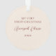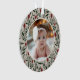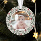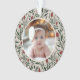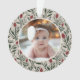 This beautiful Baby's First Christmas holiday photo ornament features a hand drawn floral and greenery pattern in classic, traditional Christmas colours of deep green, burgundy red, and ivory over a custom colour background (shown in light sand beige). A small ivory coloured frame allows your photo to stand out against the background. The back contains text templates for simple personalisation. Perfect for your new little one!