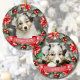 Classic Floral Frame Pet First Christmas Dog Ceramic Ornament. Capture your pet's holiday spirit with this charming two-photo Christmas ornament, beautifully framed by a watercolor poinsettia and evergreen wreath on both sides. Each side is designed with a festive red ribbon banner at the bottom, accented by cute white paw prints for a playful touch. The front displays your pet's name and the year, while the back shows the year again in a larger size, making this a truly personalised keepsake. This custom ornament brings a traditional, botanical flair with rich red and green hues, perfect for pet lovers looking to celebrate their puppy or dog in a festive, memorable way. Ideal as a gift or a treasured decoration, this "create your own" ornament is a lovely way to honour your furry friend with a touch of holiday charm.