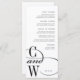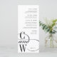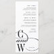 Elegant monogram menus for your wedding or rehearsal dinner feature your initials at the lower left, joined by an ornate swooping "and," on a crisp white background.