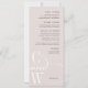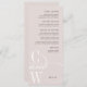 Elegant monogram menus for your wedding or rehearsal dinner feature your initials at the lower left, joined by an ornate swooping "and," on a pale greyed blush background.