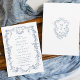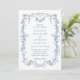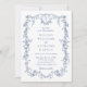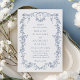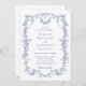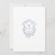 Elegant blue floral wedding invitation with a floral crest and monograms on the back.