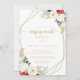 This classic gold floral engagement party invitation is perfect for a rustic event. The design features watercolor white, burgundy and gold flowers and berries with green foliage arranged into elegant bouquets.