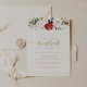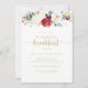 This classic gold floral wedding breakfast invitation is perfect for a rustic event. The design features watercolor white, burgundy and gold flowers and berries with green foliage arranged into elegant bouquets.