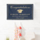 Classic dark blue graduation party welcome banner featuring a gold grad cap, "Congratulations" in an elegant calligraphy script and the graduate's name, school and class year in modern serif typography.