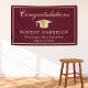 Classic burgundy red graduation party welcome banner featuring a gold grad cap, "Congratulations" in an elegant calligraphy script and the graduate's name, school and class year in modern typography.