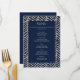 A classic herringbone background in navy and taupe present the basis for this traditional yet modern and elegant wedding reception customisable menu. A navy blue insert contains the pertinent customisable wedding information.