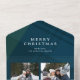 Send holiday cheer with this unique trifold photo collage Christmas card that features a classic green and navy plaid background. The elegant festive tartan-inspired pattern is the background for a collage of 6 photos. The detachable bottom has room for another photo. On the back, you can include a custom message, family update and more. Then fold and send - no envelope needed! This elegant and sophisticated all in one card is great for family photos, grandparent cards, newlyweds and more. Find other styles in the Classic Holiday Plaid collection.
