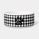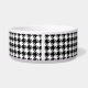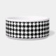 A dog bowl adorned with a classic black and white houndstooth pattern and a stylish black paw print to monogram with your pets initial.