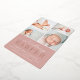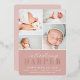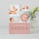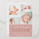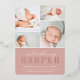 Elegant birth announcements feature four newborn photos arranged in a grid collage layout on a dusty rose blush pink background. "Introducing [name]" appears beneath in chic calligraphy script and rose gold foil block lettering. Personalise with baby's full name, birth stats, and a family signature at the bottom. A simple and clean gender neutral design for announcing your little one's arrival.